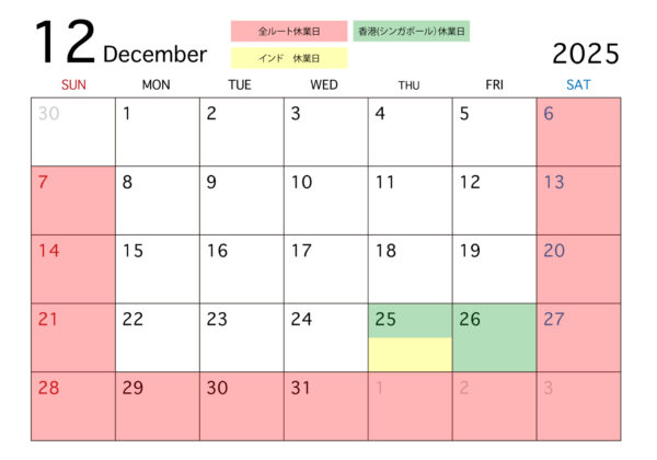 2025年12月の休業日程 (コロナ、年末年始休業含む)