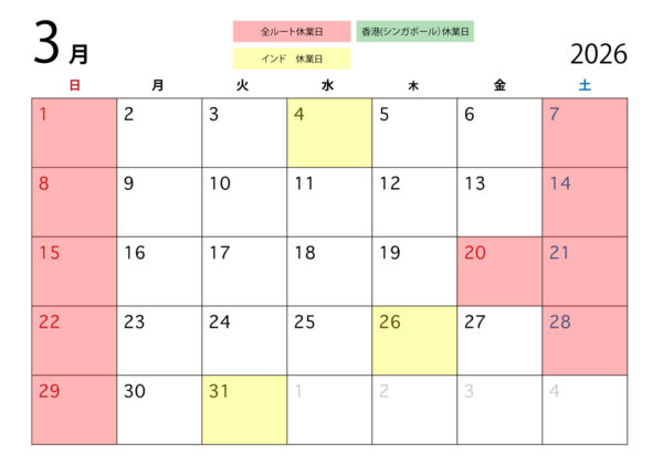 2026年3月の休業日程